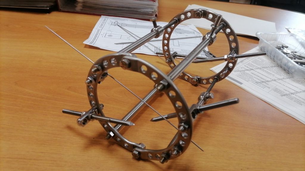 Устройство внешней фиксации, используемое для остеосинтеза (обеспечивает соединение и заживление переломов костей), основано на компрессионно-дистракционном методе и стимулирует формирование костной ткани в зоне перелома.